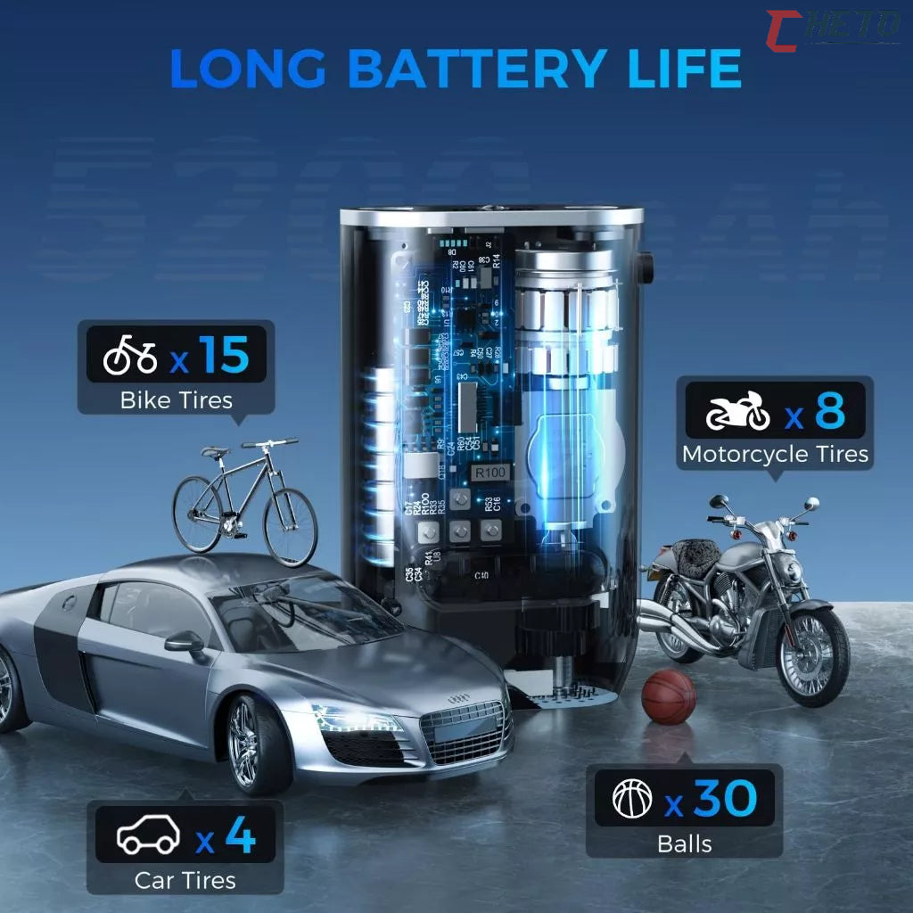 Compacto, leve e superpotente, ele enche pneus de carro, moto, bicicleta, além de bolas e pneus de scooters elétricas, tudo com pressão precisa e monitoramento digital.