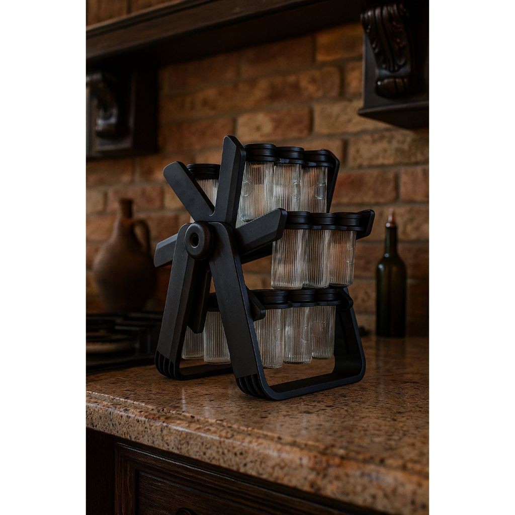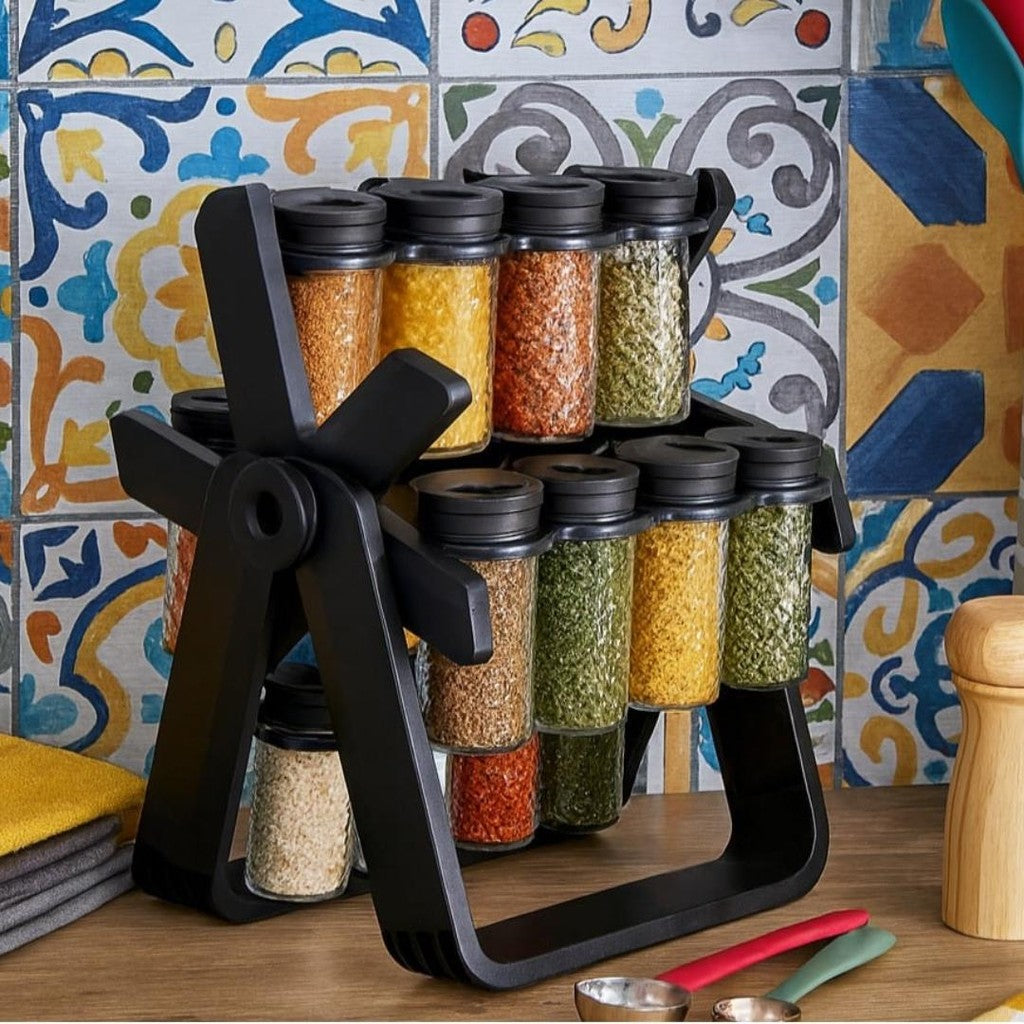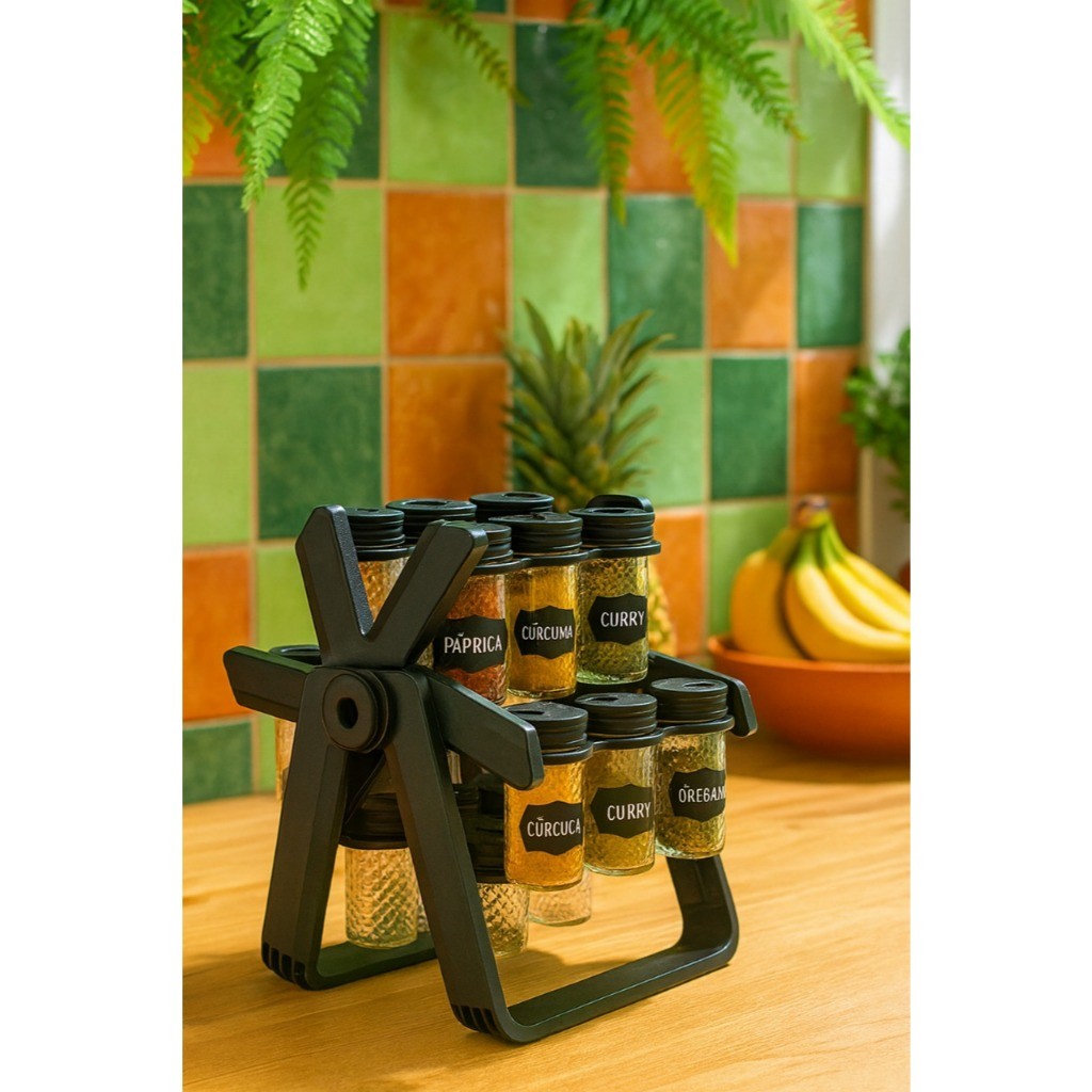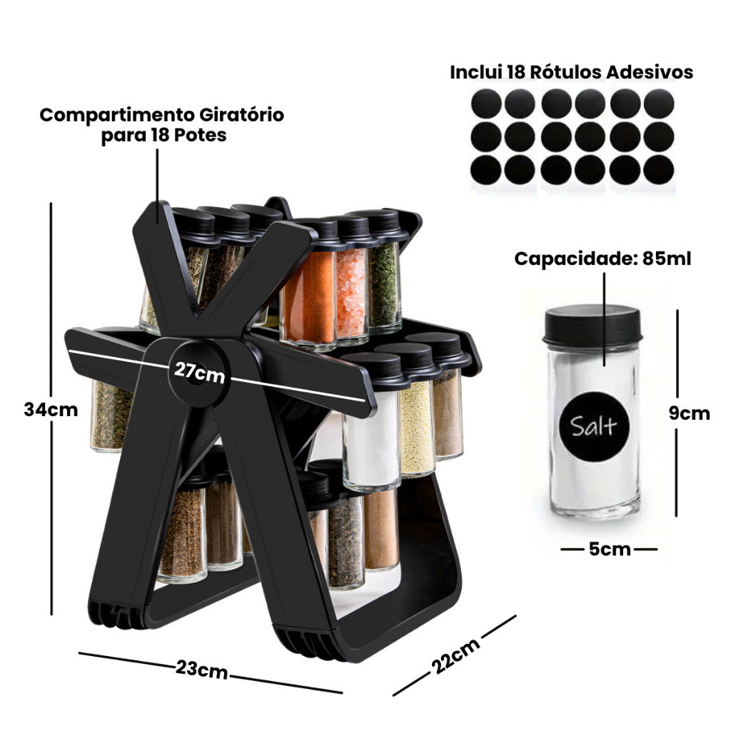 Com 18 potes de vidro e um suporte giratório moderno, você deixa tudo visível, organizado e acessível com um simples giro.