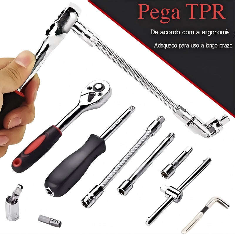 Fabricado com aço titanium vanádio de alta qualidade, o conjunto oferece resistência superior, maior torque e proteção contra ferrugem. A chave catraca de giro rápido com 45 dentes de alta precisão garante um desempenho impecável, enquanto a extensão flexível e os adaptadores permitem alcançar os lugares mais difíceis com facilidade.