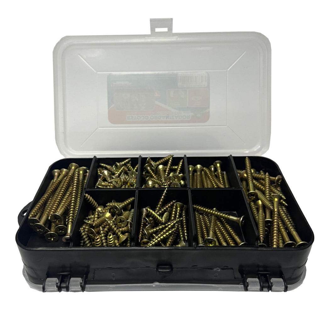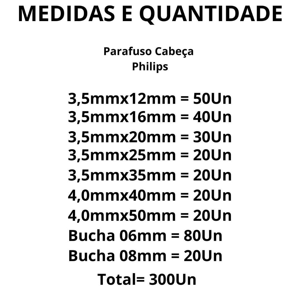 O kit contém 300 peças no total, incluindo parafusos, buchas e o estojo organizador.